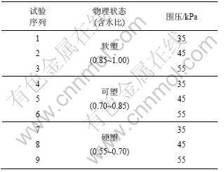 本文用到的2个动力稳定性参数临界动应力及疲劳动剪应变门槛是通过室内疲劳动力试验获得的。试验设备为国产DDS-70型电脑控制电磁式振动三轴试验系统,为满足试验需要,与厂家沟通后对原系统进行了适当改造。考虑武广高速铁路路堑基床现场边界条件及土质条件,试验方案(见表2)重点考虑含水比