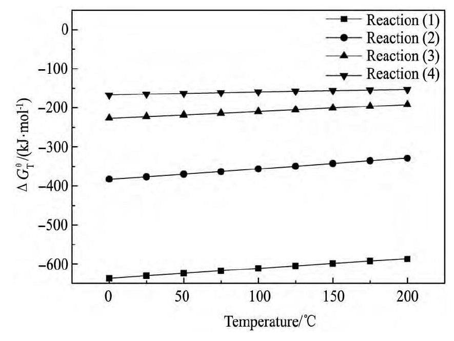 图1 反应 (1) ~ (4) 的ΔrGmθ-T的关系Fig.1 Relationship betweenΔrGmθ-T of Reaction (1) ~ (4)