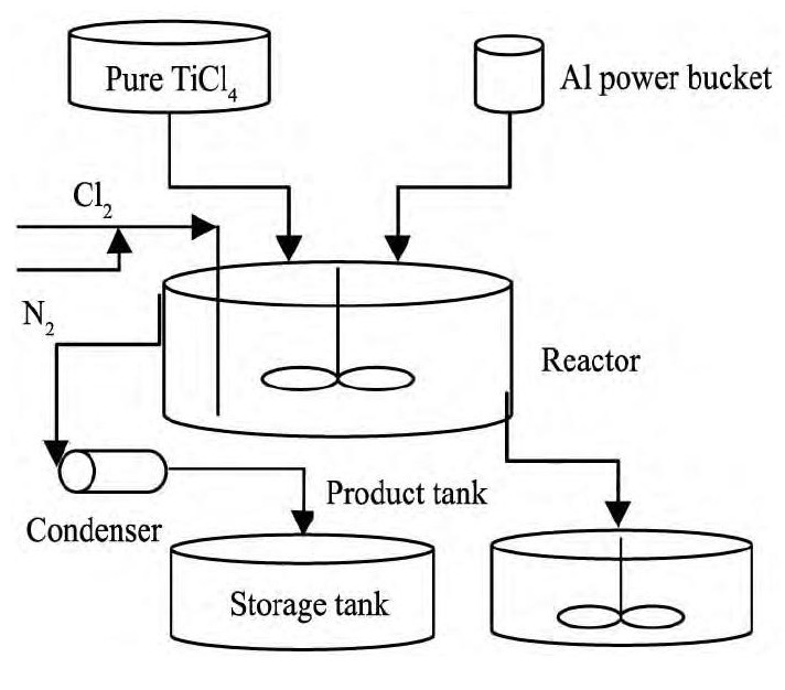 该实验所得数据来自生产装置, 生产过程如图2所示, 反应器容积为0.9 m3。实验过程中, 先将精四氯化钛加入反应罐 (材质为1Cr18Ni9Ti) 中, 利用负压 (由水力喷射器产生) 将铝粉吸入反应罐, 铝粉吸入过程氮气保护, 搅拌30 min (搅拌速度1390 r·min-1) 后通入氯气和氮气混合气体, 氯气与铝粉反应放热, 体系温度升高, 待温度达100℃停止通氯气, 铝粉与四氯化钛反应, 生成Ti Cl3和Al Cl3, 温度继续升高, 待温度开始下降时, 反应完成, 搅拌8~10 min后补加精四氯化钛至初始液位, 搅拌5~10 min, Ti Cl3浆液制备过程结束。