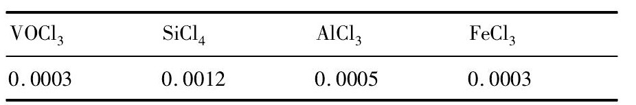 钛有比强度高、耐腐蚀及无毒等优点而被用于航空航天、化工冶金和医疗等行业[1,2,3,4,5]。四氯化钛是生产钛的原料, 其质量对钛质量具有重要影响。精制是逐步除杂过程, 杂质主要有:VOCl3, Si Cl4, Fe Cl3和Al Cl3等[6,7]。除去沸点与四氯化钛差异较大杂质技术已非常成熟, 除钒工艺则差异较大[8]。
