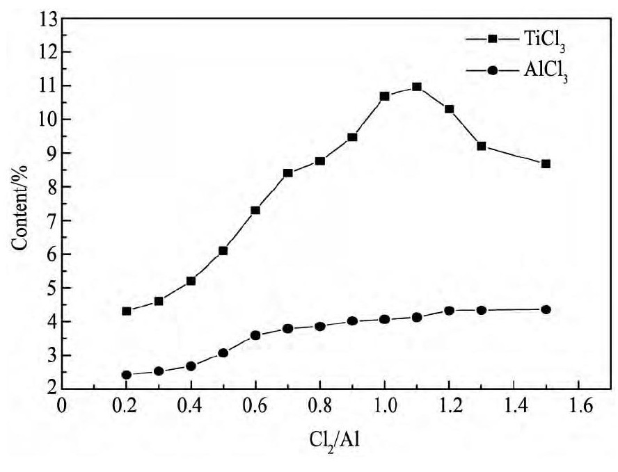 图4 Cl2/Al对Ti Cl3, Al Cl3含量的影响Fig.4 Effect of Cl2/Al on Ti Cl3, Al Cl3content