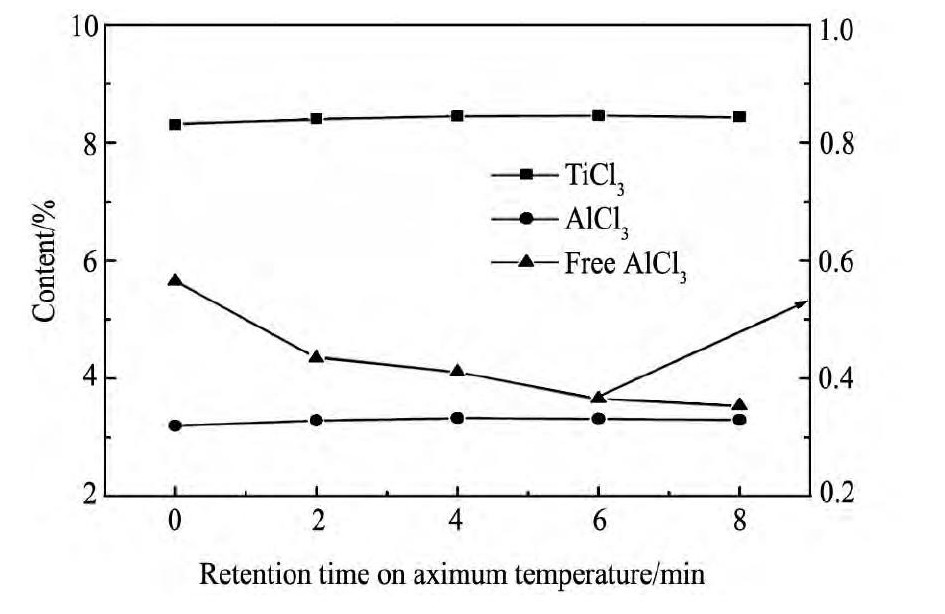 图5 最高温度停留时间对Ti Cl3, Al Cl3含量的影响Fig.5 Effect of maximum temperature retention time on Ti Cl3, Al Cl3content