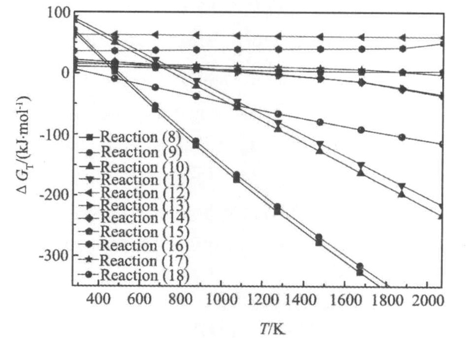 图1 反应式(8)~(18)的吉布斯自由能与温度关系