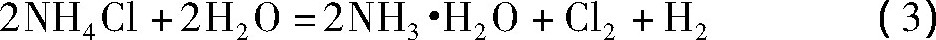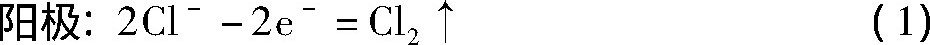 电极材料选择惰性电极石墨, 反应产生的气体, 在氮气吹脱系统的作用下导入氨气吸收装置, 阳极产生的氯气一部分溶于水, 反应方程式:Cl2+2H2O→HCl O+Cl-+H+, 反应生成的次氯酸再与水中的氨发生反应, 反应方程式:2NH3+3HCl O→N2+3HCl+3H2O;另一部分氯气与阴极产生氢气按比例反应生成氯化氢, HCl气体极易溶于水, 一体积水能溶解500体积的HCl, 最终形成盐酸溶液。
