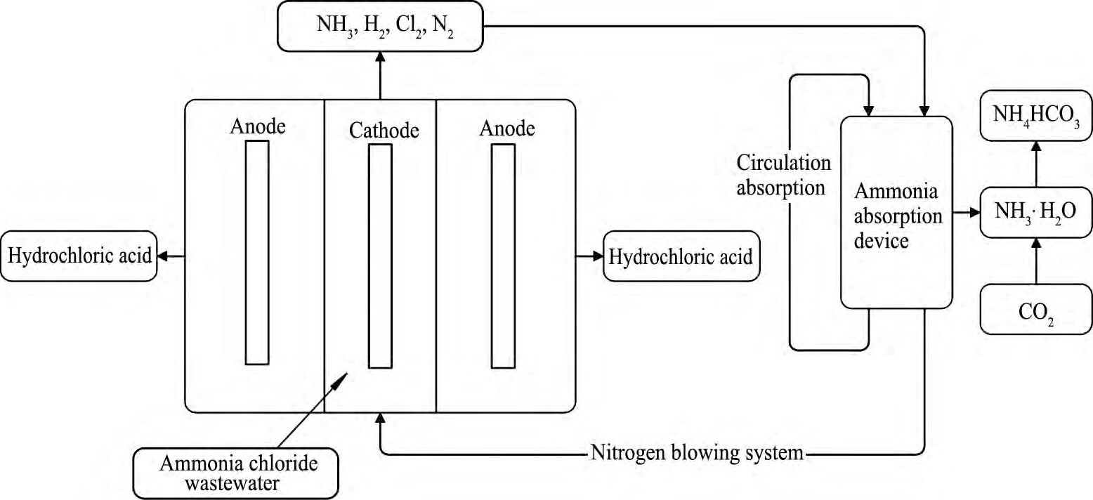氯化铵 (分析纯) , 天津市风船化学试剂科技有限公司;阴离子膜材料 (300 mm×400 mm, AMI) , 杭州绿合环保科技有限公司;电解槽设备 (350 mm×100 mm×200 mm, 有机玻璃) ;块状石墨电极 (10 mm×200 mm×250 mm) ;电解电源 (100 A, 36 V, 输入电压380 V) , 广州辰镀电源科技有限公司;氮气 (纯度>99%) ;二氧化碳 (纯度>99%) ;电感耦合等离子体原子发射光谱仪, 美国热电公司。