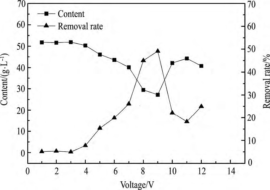 采用三槽双膜自制小试样机, 固定极板间距离4 cm, 电解水量1000 cm3, 模拟氯化铵废水杂质成分及浓度范围 (51.76 g·L-1) , 采用石墨作为电极材料 (阴极、阳极相同) , 采用阴离子膜, 电解6 h取氯化铵的浓度进行测定, 电压分别设定为1, 2, 3, 4, 5, 6, 7, 8, 9, 10, 11, 12 V。