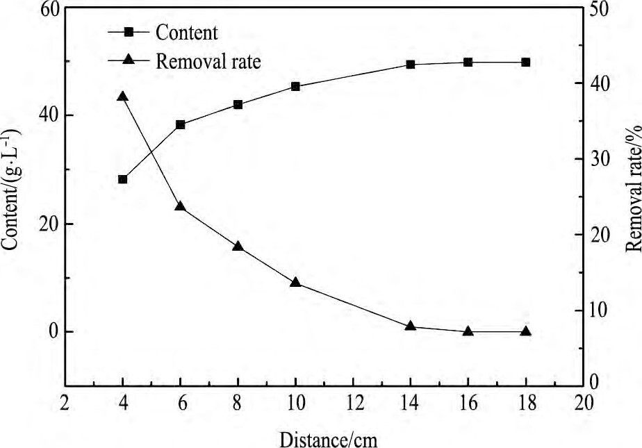 采用三槽双膜自制小试样机, 分别固定极板间距离4, 6, 8, 10, 14, 18 cm, 电解水量1000cm3, 采用石墨作为电极材料 (阴极、阳极相同) , 采用阴离子膜, 氯化铵初始浓度51.76 g·L-1, 电压为9 V, 电解6 h后取氯化铵的浓度进行测定。极板间距离对除氯化铵影响的试验结果如图3所示。
