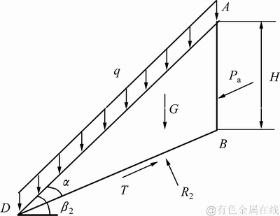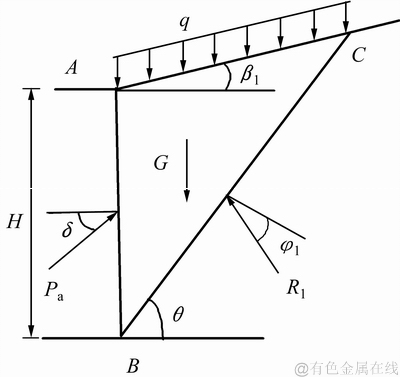 ,均布切力作用方向沿AC面向上;BC面上作用有下部矿体对滑体的支撑力R1,R1的方向指向滑体ABC;滑体ABC的形心处作用有滑体的重力G。