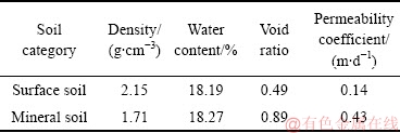 在屏南选定某全覆式稀土矿山一陡坡区域,确定该区域表土厚度。通过取原状样测试表土和矿土的初始密度和初始含水率,通过单环法现场测试表土和矿土的渗透系数,具体参数如表1所列。
