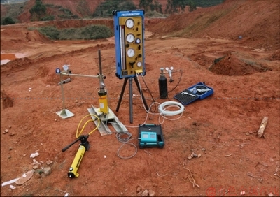 现场测试时,通过人为注水的方式改变各个测点的体积含水率,待各个测点体积含水率基本稳定后,采用APAGEO原位钻孔剪切仪现场测试矿体的抗剪强度参数,测点深度为4.0 m左右,测试图如图3所示,测试步骤主要包括:1) 在测试地层中钻孔,并通过取样器清孔使孔壁光滑;2) 将探头放入孔中,加压使探头膨胀使得侧刃嵌入周围土体中;3) 利用千斤顶对探头施加垂直向上的提拉力,使得嵌入土体的侧刃对周围土体进行剪切,通过测力装置测定剪切时的剪切应力。
