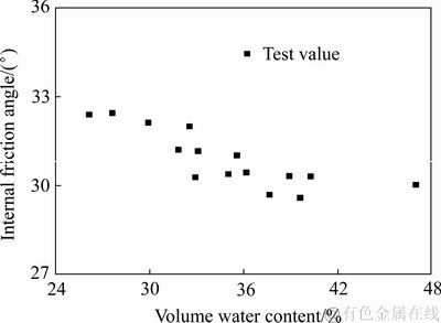 2) 矿体内摩擦角随着体积含水率的增大基本保持不变,矿体黏聚力的对数与其体积含水率呈线性关系。