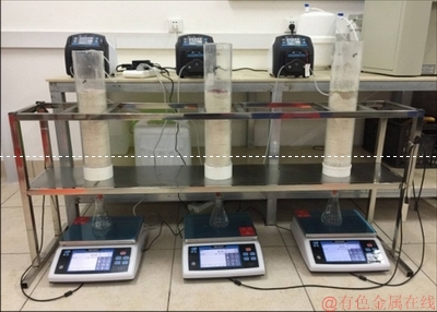 矿体天然状态下的密度为1.71 g/cm3,体积含水率为0.28,稀土离子品位为0.065%,据此制作矿样,矿样直径10 cm,高度35 cm;自柱浸桶底部开始自下而上放置透水石、滤纸、粗砂、矿样、滤纸和粗砂,装置如图8所示。试验通过调节蠕动泵流量来控制矿样体积含水率,矿样体积含水率的变化范围为0.314~0.384;试验开始时,先用去离子水以恒定流速在矿土中形成稳定流场(流进、流出水量或流速相等),再将去离子水置换成浓度为20 g/L的硫酸铵溶液,开始恒定流速下的非饱和浸矿试验;从注硫酸铵溶液开始,每隔100 g收集一次浸取液,并化验浸取液中的稀土离子;待浸取液中稀土离子浓度下降到0.01 g/L以下时,试验结束。