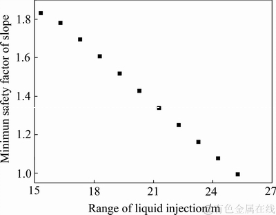 Fig. 12 Change law of minimum safety factor of slope with range of liquid injection