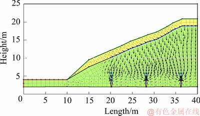 首先,先进行渗流计算,如图14所示。由图14可知,在有巷道工程收液的情况下,矿体内部溶液的渗流方向基本竖直向下,说明理论模型计算时假设未注液区域不受注液区域影响是合理的。