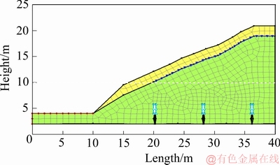 为验证模型计算结果的有效性,现根据现场实测数据,建立坡度为25°的矿山模型进行数值计算。为简化计算,在数值建模时进行如下简化,模型网格划分图如图13所示,图中蓝色线代表注液范围。