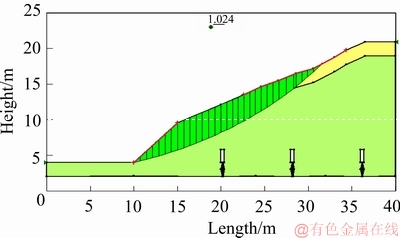 完成渗流计算后,进行边坡安全系数的计算,确定潜在滑移面,如图15所示。经过计算可知,当注液范围约为22.70 m时,最小边坡安全系数为1.02,边坡处于临界安全状态,则该注液范围即为临界注液范围,本文理论模型所计算临界注液范围为26.28 m,两者的相对误差值为15.77%。故对于坡度为25°的边坡,本文理论模型可较好的预测出稀土矿山的临界注液 面积。