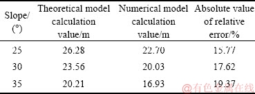 同理,可得到水平距离为30 m,坡度分别为30°和35°时临界注液范围的理论模型计算值和数值模型计算值,如表2所列。由表2可知,对于坡度为25°、30°和35°的边坡模型,临界注液范围理论计算值与数值计算值的相对误差值在20%以内,相对误差较小,说明了本文临界注液范围理论计算模型的有效性。