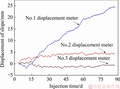 为监测山体变形情况,将距离山脊线10 m左右位置处作为起点,第一段缓坡区域布置一个位移计,跨度20 m,命名为1号位移计;第二段和第三段陡坡区域布置两个位移计,跨度15m,分别命名为2号和3号位移计。从注液开始即监测山体的边坡变形情况,如图16所示。由图16可知,随着注液时间的增加,缓坡区域处于拉伸状态,在注液的第87 d边坡位移达到4.5 mm;陡坡区域上部处于拉伸状态,在注液的第87 d边坡位移达到24.4 mm;陡坡区域下部处于压缩状态,在注液的第87 d边坡位移达到-2.4 mm。故随时间推移,边坡中前部位移不断增大,其产生的推力不断向边坡后部传递,造成边坡后部的压缩,边坡可能发生滑裂口位于后部的整体式滑移,由这种滑移方式形成的滑坡称为推移式滑坡[11]。
