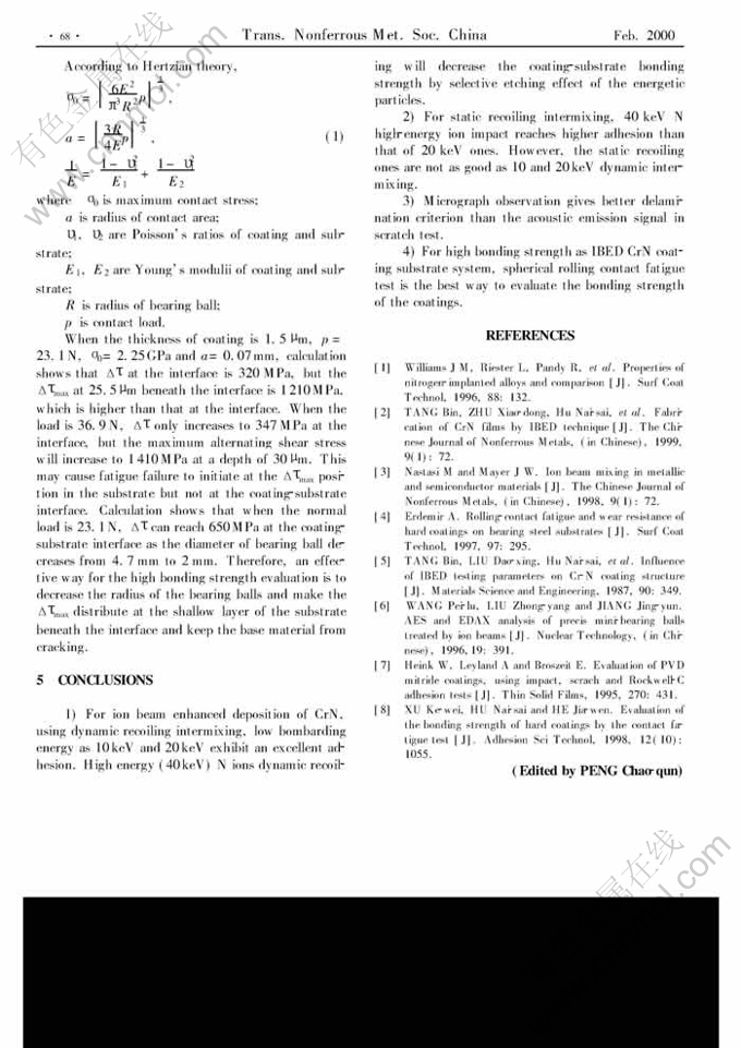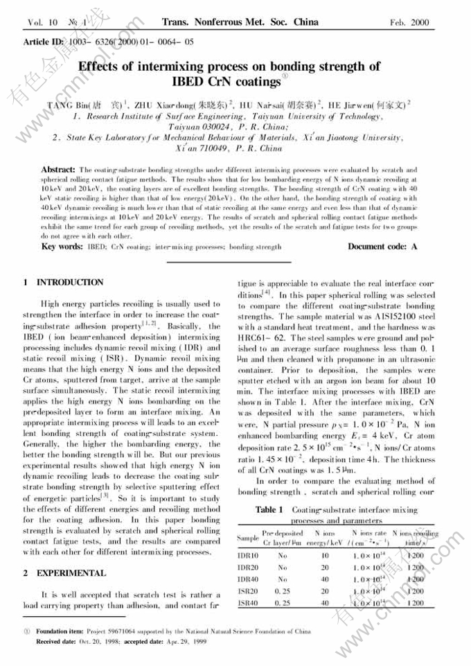 Key words:IBED; CrN coating; inter-mixing processes; bonding strength
