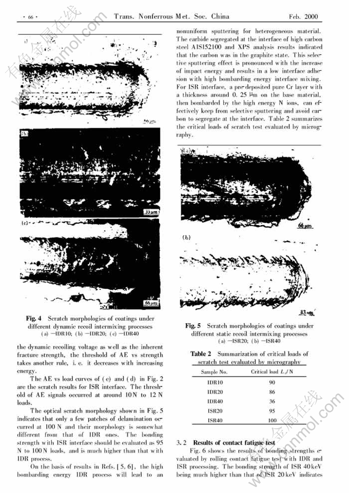 Abstract: The coating-substrate bonding strengths under different intermixing processes were evaluated by scratch and spherical rolling contact fatigue methods. The results show that for low bombarding energy of N ions dynamic recoiling at 10 keV and 20 keV, the coating layers are of excellent bonding strengths. The bonding strength of CrN coating with 40 keV static recoiling is higher than that of low energy(20 keV). On the other hand, the bonding strength of coating with 40 keV dynamic recoiling is much lower than that of static recoiling at the same energy and even less than that of dynamic recoiling intermixings at 10 keV and 20 keV energy. The results of scratch and spherical rolling contact fatigue methods exhibit the same trend for each group of recoiling methods, yet the results of the scratch and fatigue tests for two groups do not agree with each other.