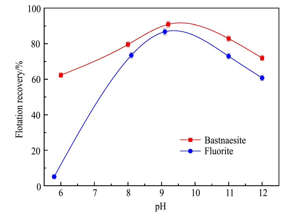 Fig.1 Flotation recoveries of bastnaesite and fluorite single mineral as a function of pH