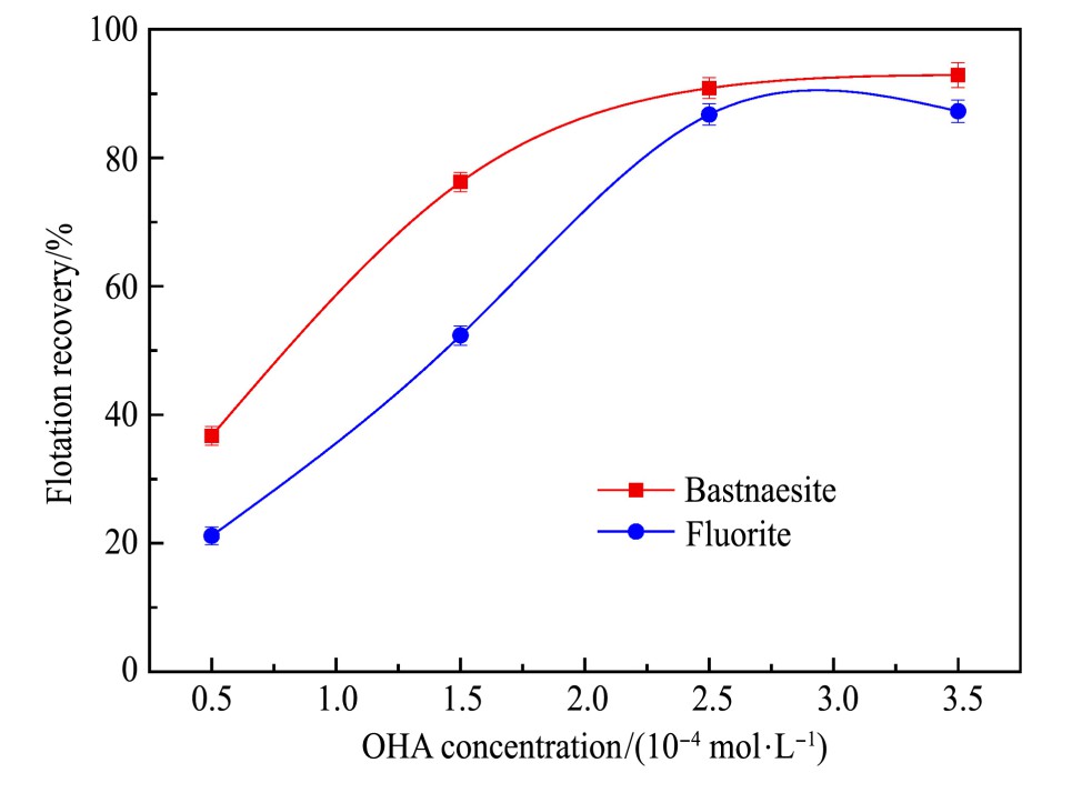 图2 捕收剂OHA浓度对氟碳铈矿和萤石单矿物浮选的影响