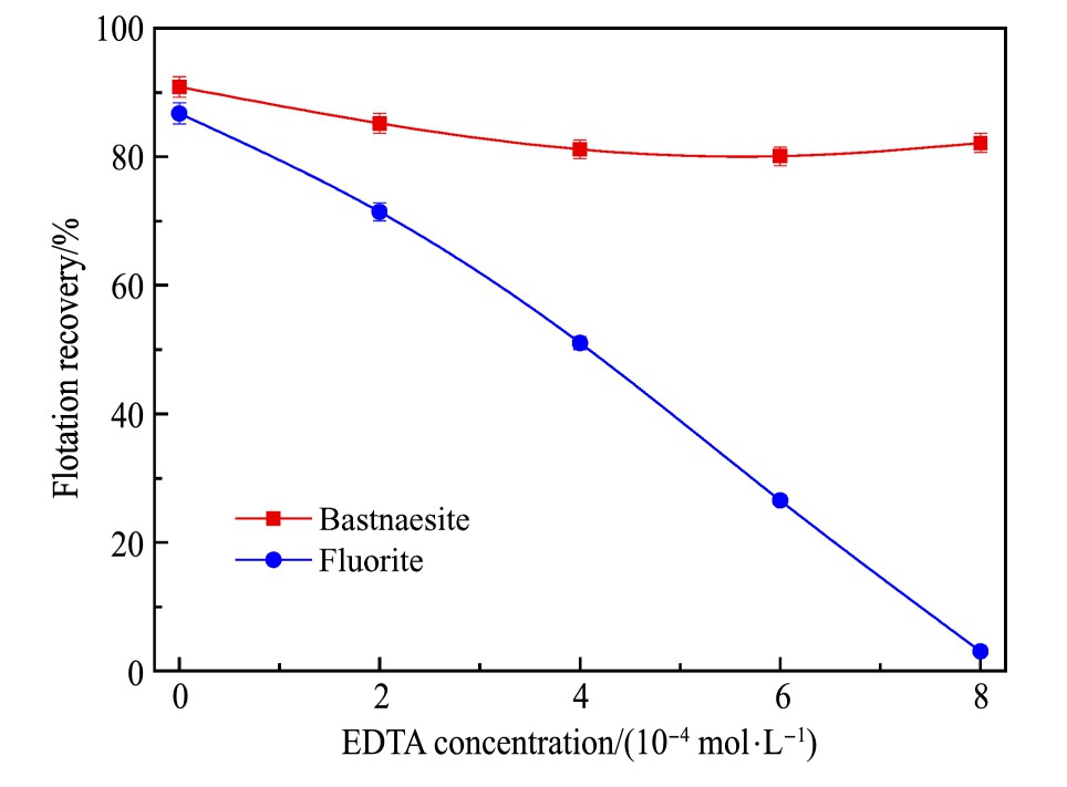 Fig.3 Flotation recoveries of bastnaesite and fluorite single mineral as a function of EDTA concentration