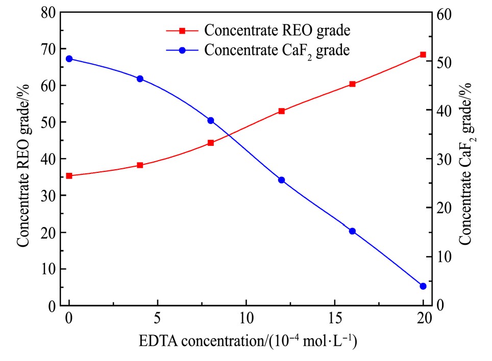 Fig.6 REO grade and fluorite content of flotation concentrate as a function of EDTA concentration