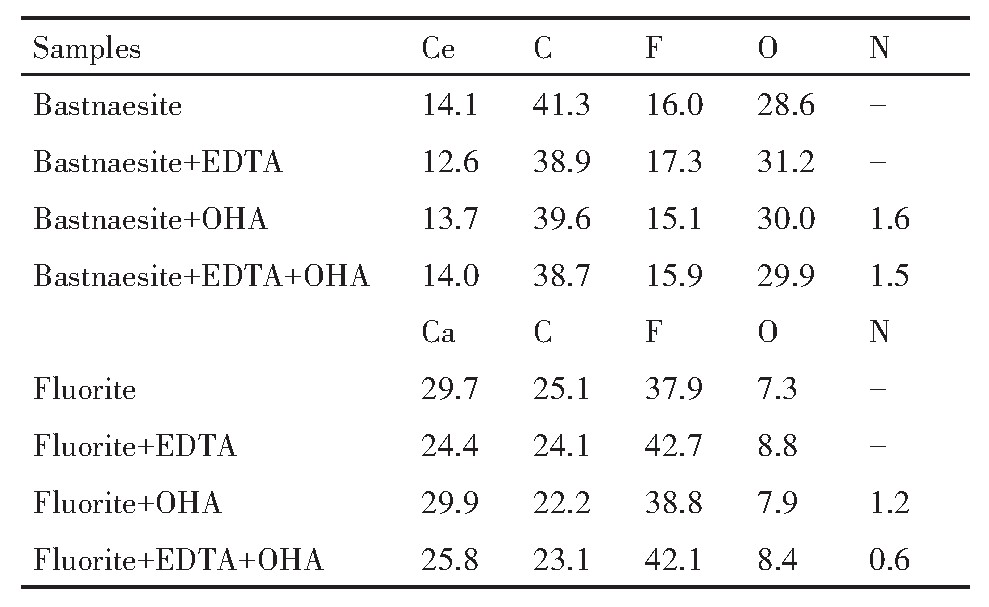 Table 1 Atomic concentration on surfaces of bastnaesite and fluorite unconditioned and conditioned in 8×1 0-4mol·L-1EDTA,2.5×1 0-4mol·L-1OHA inpidually and in their combination(%,atom fraction)