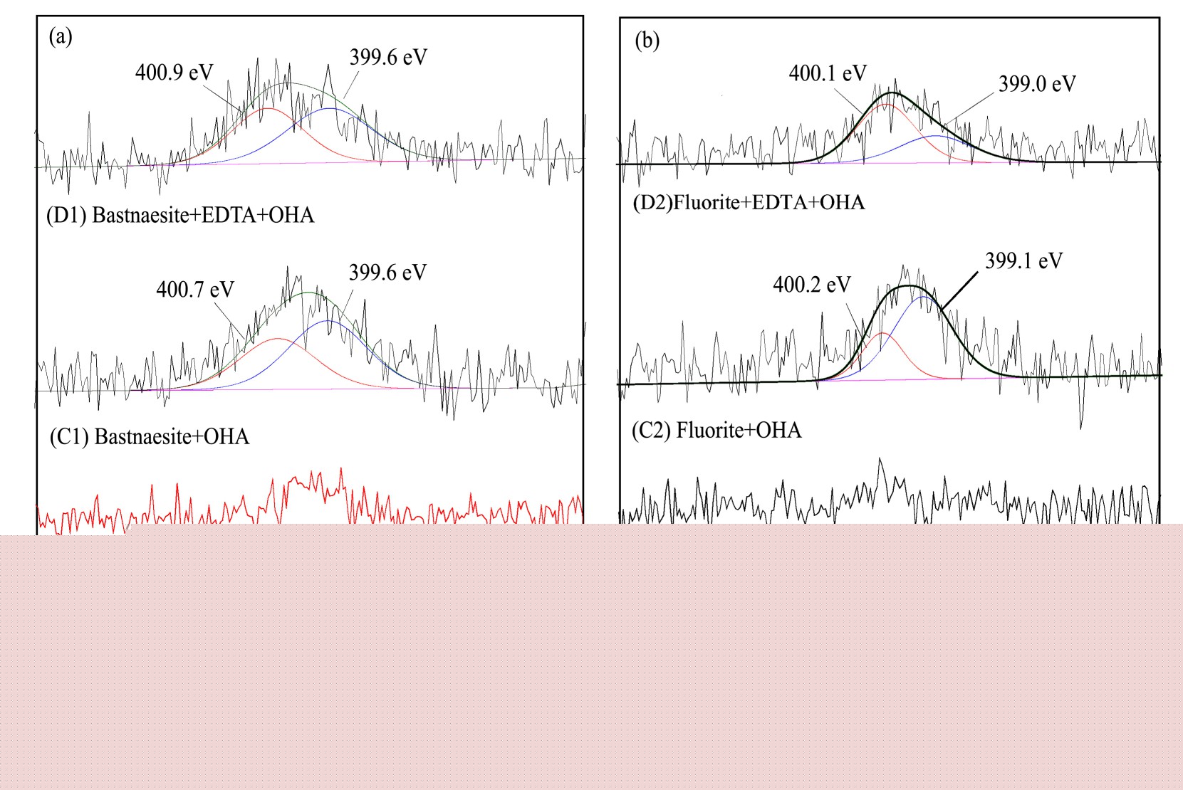 图8为氟碳铈矿和萤石与EDTA或OHA单独作用前后及与EDTA、OHA共同作用后的N 1s XPS图谱。由A1和B1可以看出,氟碳铈矿本身或经EDTA调整后表面都无N 1s峰出现,说明氟碳铈矿表面无EDTA吸附,由C1可以看出,添加捕收剂OHA后氟碳铈矿表面N 1s峰拟合为400.7和399.6eV两处峰,两者比例分别为41.88%和58.12%。Ni等
