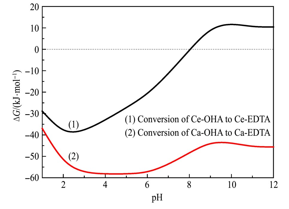 图9 M-OHA转化为M-EDTA的吉布斯自由能变化与pH的关系(M为Ce或Ca)