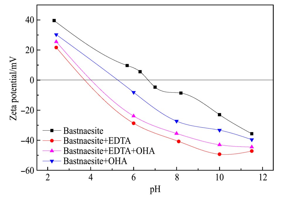 图1 0 EDTA及OHA对氟碳铈矿表面动电位的影响