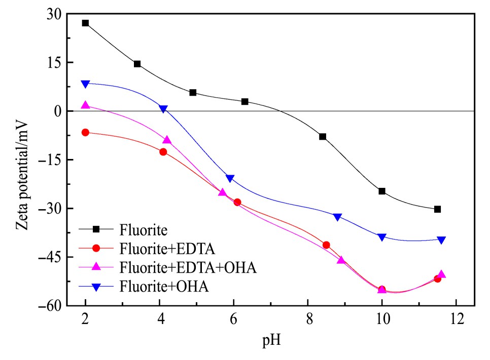 Fig.11 Zeta potential of fluorite as a function of pH in the presence of EDTA(8×10-4mol·L-1),OHA(2.5×10-4mol·L-1)and in combination of EDTA and OHA
