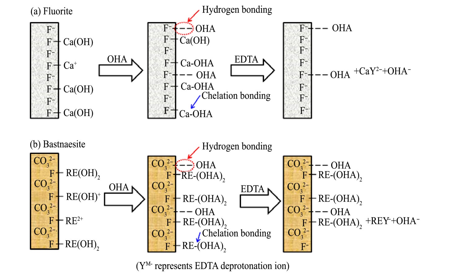 图1 2 EDTA及OHA在萤石和氟碳铈矿的表面作用过程