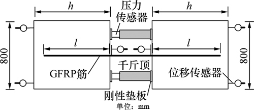 目前,对GFRP筋黏结性能的试验研究较少。它们都按钢筋黏结性能试验方法进行拔出试验和梁式试验[12-15]。黏结破坏的主要形态为拔出破坏和劈裂式破坏。本次试验是在试验室支模,竖向浇筑混凝土,用来模拟地下结构底板,采用1组2个对浇,内部设置直径28 mm的GFRP螺纹锚筋,锚筋联通,中间预留千斤顶及测力计的位置,待混凝土达到设计强度时,利用1对油压千斤顶同步加荷,通过标定好的荷重传感器测读加荷值,2个试件进行对拉,对拉可以解决锚杆夹具问题,同时也可以减少在试验加载过程中由于采用穿心千斤顶对GFRP抗浮锚杆周围混凝土的约束造成的影响;另外,2个试件对拉能同时进行2个平行试验,试验证明这种做法可行。试验装置如图1所示。模拟底板的混凝土块截面长×宽为800 mm×800 mm,厚度h分别为500 mm和900 mm,以变化锚固长度。为了比较,同时进行2组直锚筋锚固试验,锚筋长度l分别为420 mm和840 mm,共进行2组试验,每组有2个平行试验。