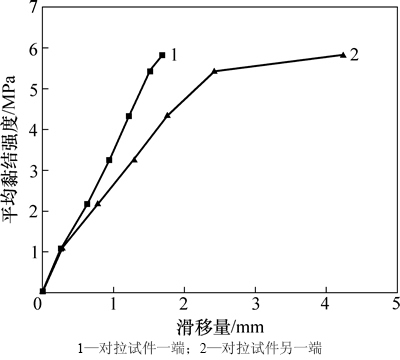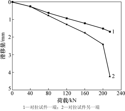 由图3可知:对拉试件两端荷载-滑移曲线变化规律有所不同,在最后1级加载过程中,加载至极限荷载215 kN时,试件一端滑移为1.82 mm,另一端滑移为0.17 mm,两端总滑移分别为1.69 mm和4.24 mm。总滑移相差2.55 mm,主要是由于试件制作的差异和加载过程中的荷载偏心导致对拉试件两端的外锚固极限承载力不同,滑移较大的一端发生拔出破坏。