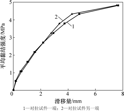 6) 在每级对拉荷载作用下,GFRP抗浮锚杆与混凝土平均黏结强度随试件两端的滑移的增加而提高,随着滑移的继续增加,平均黏结强度的增加速率变小。