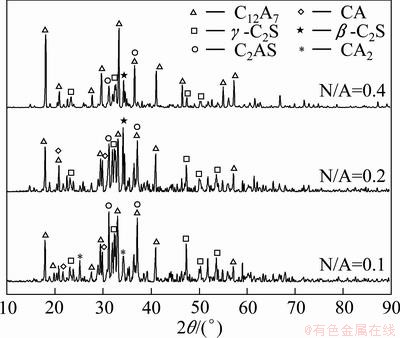 The XRD patterns of sintered clinkers at different N/A ratios are shown in Fig. 1. When N/A=0.1, the clinker contains C2AS, C12A7, β-C2S, γ-C2S as well as some CA and CA2. As the N/A ratio increases to 0.2, the phase composition and content of clinker are different. The content of C12A7 increases, while the content of C2AS decreases. Meanwhile, CA2 disappears, and β-C2S is formed during the sintering process. When N/A=0.4, most of the clinker is C12A7, and the content of C2AS is very low. Furthermore, both CA and CA2 do not exist, while β-C2S and γ-C2S coexist in the clinker. It can be concluded that as the molar ratio of Na2O to Al2O3 increases from 0 to 0.4, the proportion of C12A7 in the clinker increases with the increase of N/A ratio when A/S=3.0 and C/A=1.0.