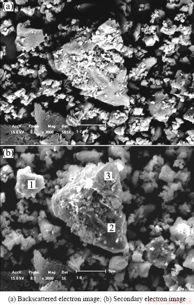 When N/A=0.4, the representative microstructure of sintered clinker is shown in Fig. 2. The morphology of particles is massive, and the particles can be divided to two kinds by the size. Most of the particles have a larger size, and are usually several micrometers, even larger than 10 μm. The other particles are relatively small, and are usually smaller than 1 μm. These particles are adsorbed on the surface of the larger particles.