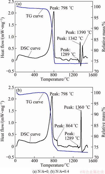 The DSC heating and TG curves of both samples with the N/A ratios of 0 and 0.4 are shown in Fig. 3. Two strong endothermic peaks with a large gravity decrease at 798 °C exist in both curves, indicating that they relate to the decomposition of CaCO3. A small endothermic peak with a small gravity decrease at 864 °C in Fig. 3(b) indicates that it relates to the melting of Na2CO3. C2S is formed below 1300 °C [4], occurring at the endothermic peaks between 1000 °C and 1300 °C for both samples. As shown in Fig. 1, C12A7 is the main phase in the clinker when the N/A ratio is 0.4, and therefore, the large endothermic peak at 1360 °C in Fig. 3(b) relates to the formation of C12A7. As an intermediate phase, C2AS is formed before C12A7 in the CaO-Al2O3-SiO2 system [4]. Therefore, the endothermic peak at 1342 °C should be associated with the formation of C2AS, and the endothermic peak at 1390 °C represents the formation of C12A7. Addition of Na2O can not only promote the formation of C12A7 and inhibit the formation of C2AS, but also decrease the formation temperature of C12A7 by 30 °C.