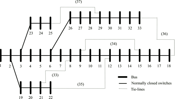The test systems that are used in this study have some tie lines. It is considered that the total number of tie switches is maintained after reconfiguration. In other words, whenever one of the tie switches is closed, one of the closed switches will be opened and the network remains in radial structure simultaneously feeding all loads. The first test system as shown in Fig. 7 is a 33-bus distribution system with a total load of 3.7 MW and 2.3 MVar having 5 ties and 32 sectionalizing switches [25]. The power flow is performed using Sbase=100 MVar and Vbase=12.66 kV.