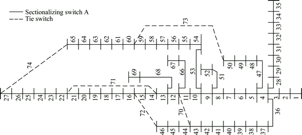 The second distribution test system as shown in Fig. 8 is a 69-bus distribution system with a total load of 3.8 MW and 2.7 MVar. The system consists of 74 branches as well as five tie switches, while the load is assumed to be constant [26].