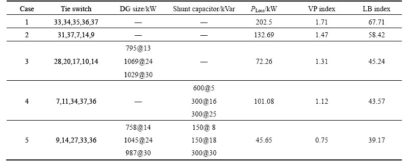 The results of the proposed approach for 33-bus test system are presented in Table 1 for the five tested cases. It is observed from Table 1 that base case power loss in the system is 202.5 kW, which is reduced to 132.69, 72.26, 101.08 and 45.65 kW for cases 2 to 5 respectively. VP index is calculated as 1.71, 1.47, 1.31, 1.12, and 0.75