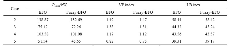 and LB index is obtained as 67.71, 58.42, 45.24, 43.57, and 39.17 for cases 1 to 5, respectively. Also, Table 1 shows the optimal location and size for DGs and shunt capacitors for the cases 3 to 5. By comparing the improvements obtained for cases 2 to 5 with the base case (case 1), it is found that simultaneous reconfiguration with DG and shunt capacitors allocation (case 5) has 77.41%, 42.15%, and 56.14% improvements in Ploss, LB, and VP indices, respectively. Also, as presented in Table 2 the results of BFO method (without fuzzy system) for 33-bus test system shows that the power loss is 138.87, 75.12, 103.58, and 51.24 kW, VP index is 1.49, 1.38, 1.17, and 0.82, and LB index is 58.44, 44.32, 43.56, and 39.31 for cases 2 to 5, respectively. The obtained results show that the performance of fuzzy-BFO approach is better as compared to the BFO (without fuzzy system) for 33-bus test system.