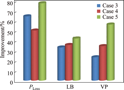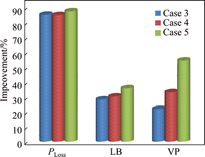 Fig. 9 Percentage improvements in PLoss, LB and VP indexes for cases 3-5 in 33-bus distribution system