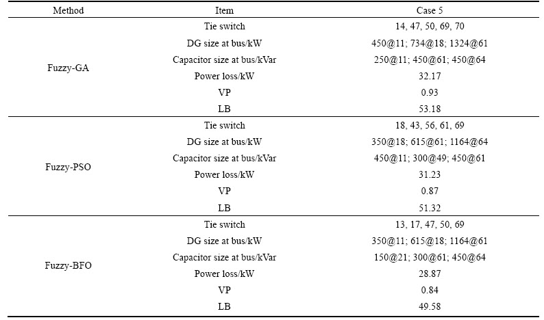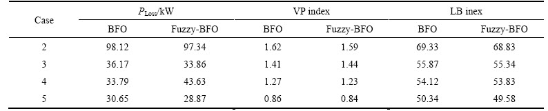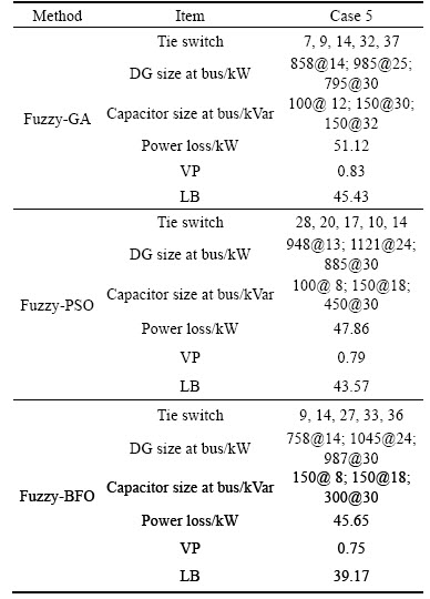 algorithms. All parameters of each algorithm are tuned for achieving the best solution. The results of different methods on both test systems are presented in Table 3 for the case 5. From Table 3, for the 33-bus test system PLoss is calculated as 51.12, 47.86, and 45.65 kW, VP is obtained as 0.83, 0.79, and 0.75 and LB is 45.43, 43.57, and 39.17 using fuzzy-GA, fuzzy-PSO, and fuzzy-BFO approaches, respectively.