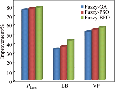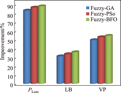 Figure 10 shows the percentage improvements in PLoss, LB, and VP indices using the fuzzy-GA, fuzzy- PSO, and fuzzy-BFO approaches for case 5 compared with the base case (case 1) in 33-bus test system.