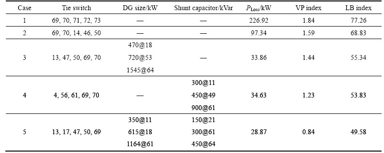 The results of the proposed approach for 69-bus test system are presented in Table 7 for the five tested cases. It is observed from Table 1 that base case power loss in the system is 226.92 kW, which is reduced to 97.34, 33.86, 33.63 and 28.87 kW for cases 2 to 5 respectively. VP index is calculated as 1.84, 1.59, 1.44, 1.23, and 0.84 and LB index is obtained as 77.26, 68.83, 55.34, 53.83 and 49.58 for cases 1 to 5, respectively. Also, Table 7 shows the optimal location and size for DGs and shunt capacitors for the cases 3 to 5.