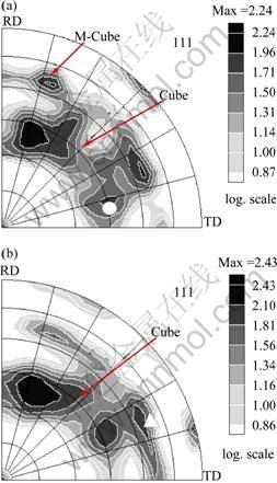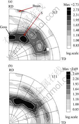 The experimental {111} pole figures of the cold rolled samples to thickness reduction of 50% and 75% are respectively shown in Figs. 2(a) and (b). Weak texture of multiple components including essentially Brass {011}á211?, S {123}á634? and Goss {011}á100? orientations is developed. The result is in agreement with the study by WANG et al [7-8] which evidenced that the texture of cold rolled Pb-Ca-Sn belongs to the commonly observed cold deformation texture of FCC alloys. It is known that the value of the stacking fault energy (γSFE) determines the type of texture of the material. It is estimated the value of γSFE of Pb-Ca-Sn alloy in deformed state from the results of X-ray line profile analysis results. In Ref. [12] γSFE is given as: