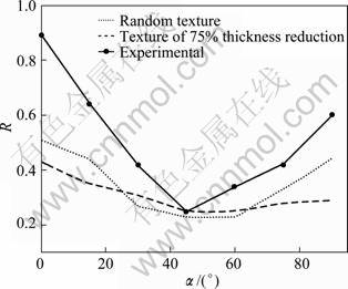 Fig. 4 Evolution of planar Lankford anisotropy or R value versus angle (α) to rolling direction for Pb-0.08Ca-2Sn samples cold rolled to a thickness reduction of 70% (Dotted and dashed lines represent plots of R value calculated using texture data with random and that of experimental pole figures)